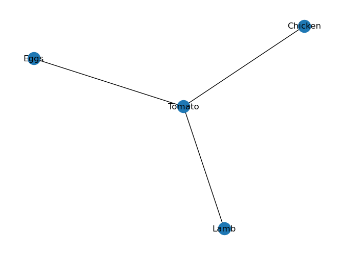 G.add_edges_from([('Tomato', 'Eggs'), ('Tomato', 'Lamb'), ('Tomato', 'Chicken')])G.nodes()