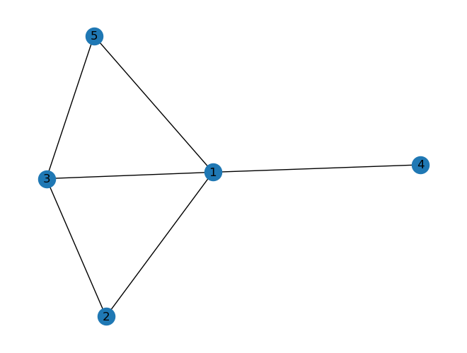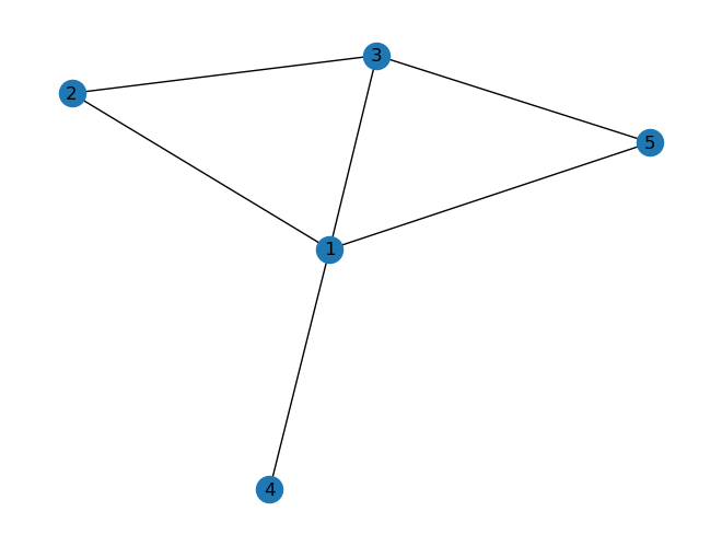 G.add_edges_from([(1, 2), (2,1), (2, 3), (1,3), (1,4), (1,5), (3,5)])# 7 tuplasnx.draw(G, with_labels=True)