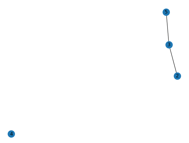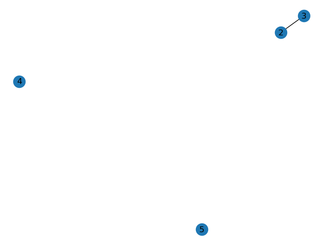 G.remove_node(1) # take notice that once you remove node 1, all edges linked with 1 will be removed as well.list(G.nodes)[2, 3, 4, 5]