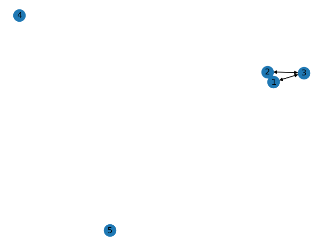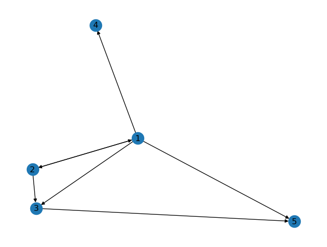 DiG.add_edges_from([(1, 2), (2, 1), (2, 3), (1,3), (1,4), (1,5), (3,5)])nx.draw(DiG, with_labels=True)