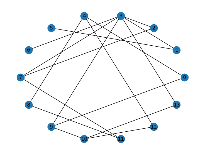 nx.draw_circular(nx.erdos_renyi_graph(14, 0.2), with_labels=True)