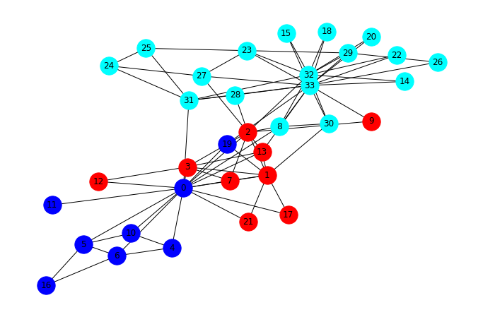 print("La modularidad de esta particion es:", Q)La mejor partición encontrada consiste en 3 comunidades: