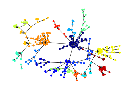nx.draw_spring(G, cmap = plt.get_cmap('jet'), node_color = values, node_size=30, with_labels=False)